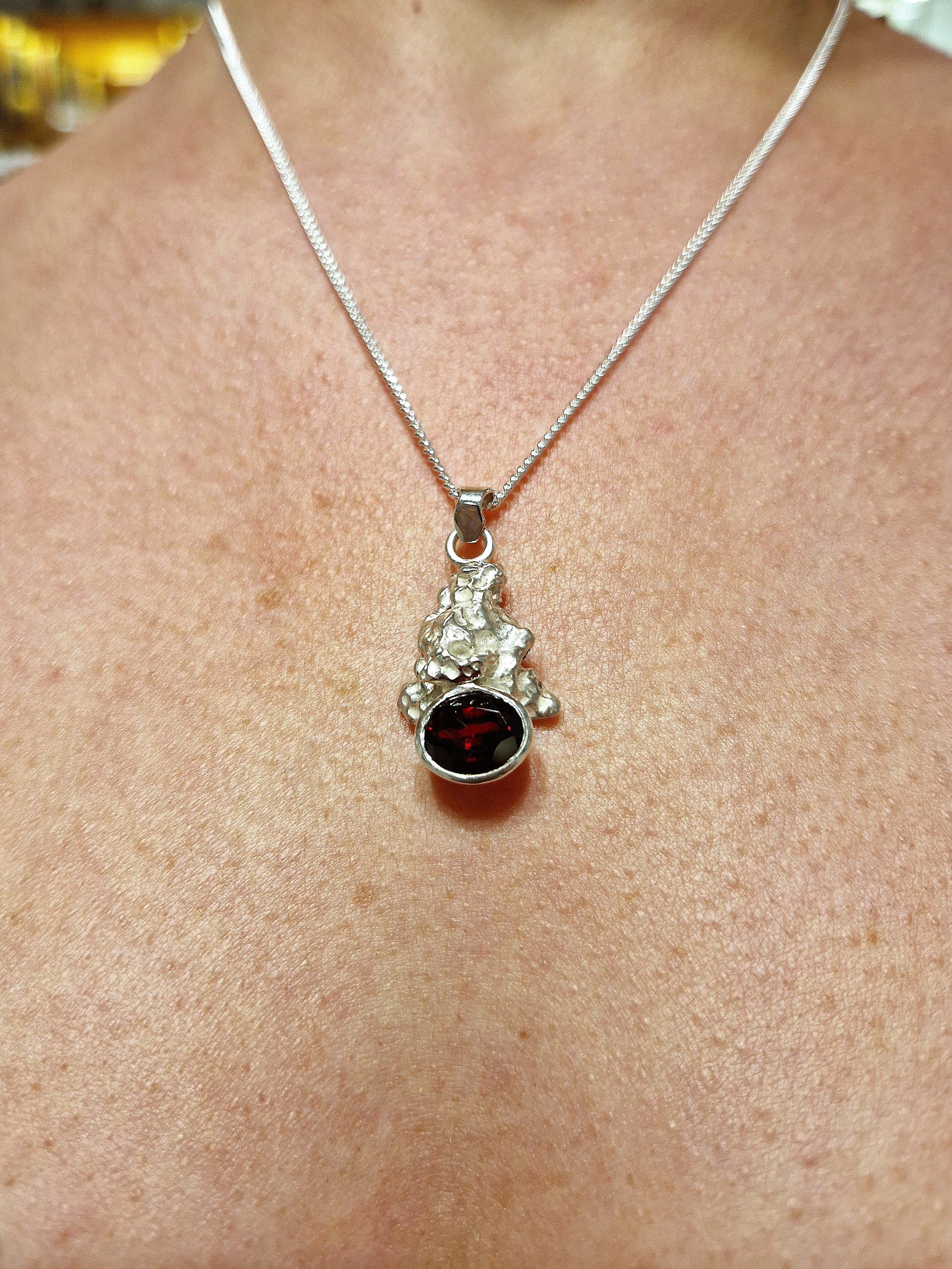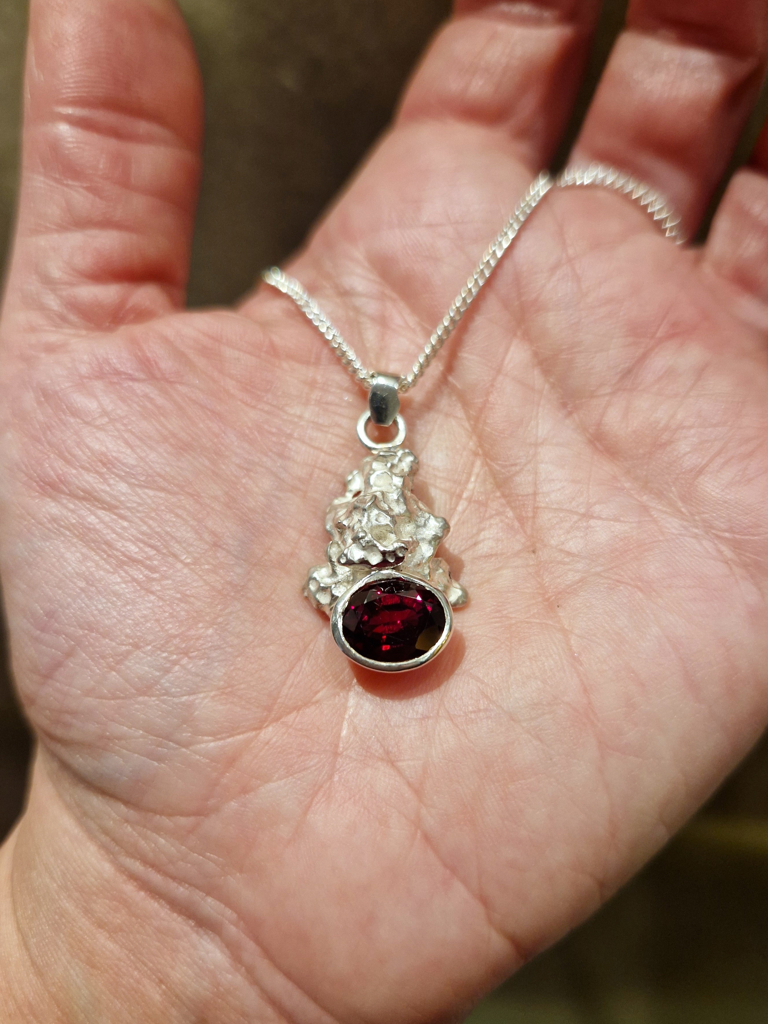 Pendentif unique "Cocon de Pépite" de la collection "Cocons", en argent 925‰ et grenat almandin ovale, chaîne non comprise.